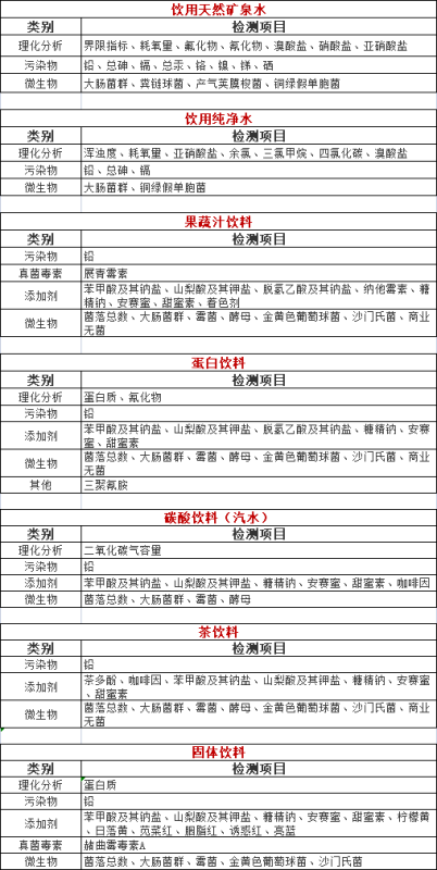 一般情况下,不同的饮料其检测项目还会有所区别,比如当你在买相似的饮料产品时,会发现不同产品的外包装印制的产品标准代号可能会有不同,有执行国家标准,有执行行业标准,也有的执行企业标准,而饮料的检测项目主要依据的就是这些标准。